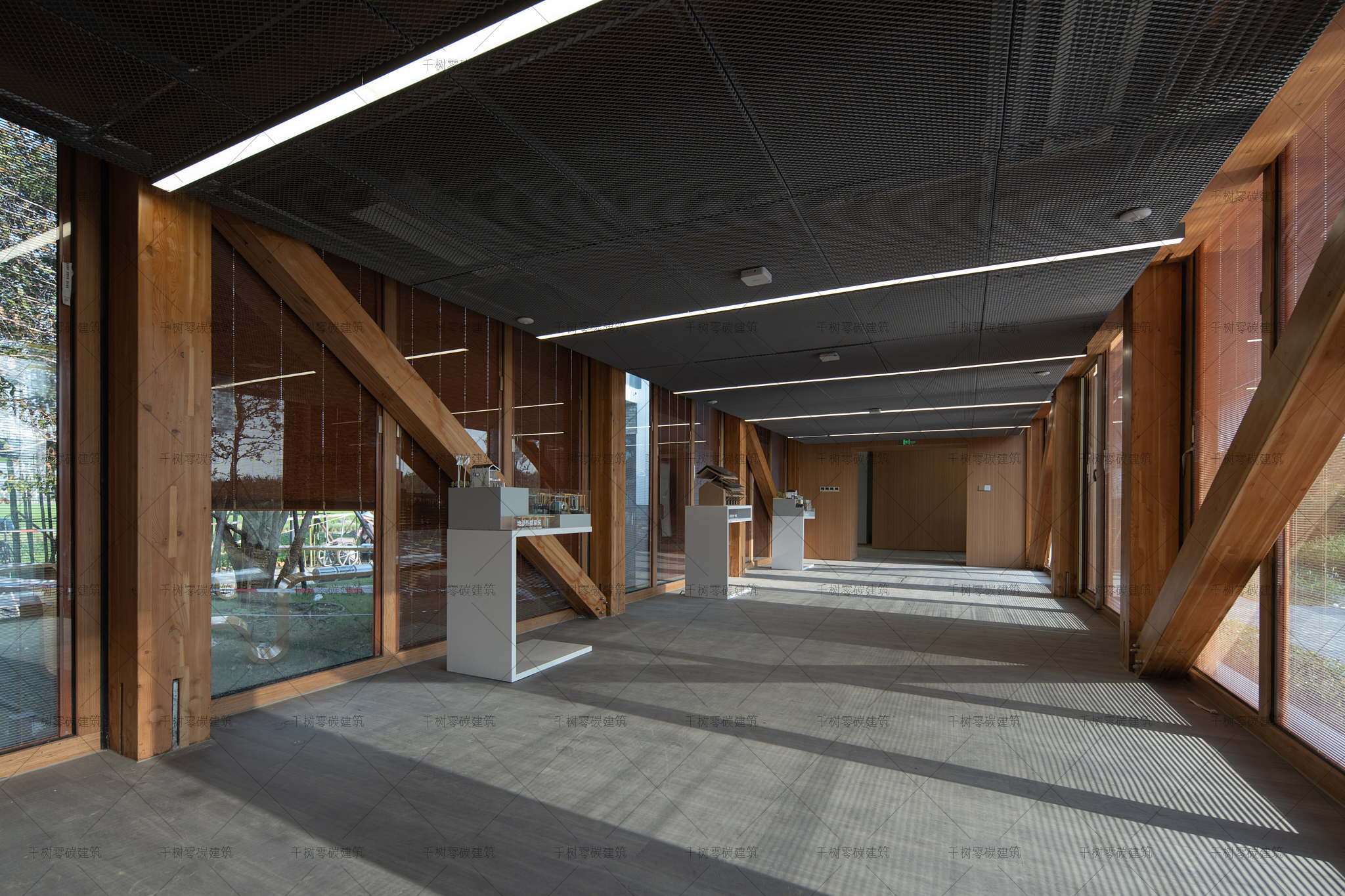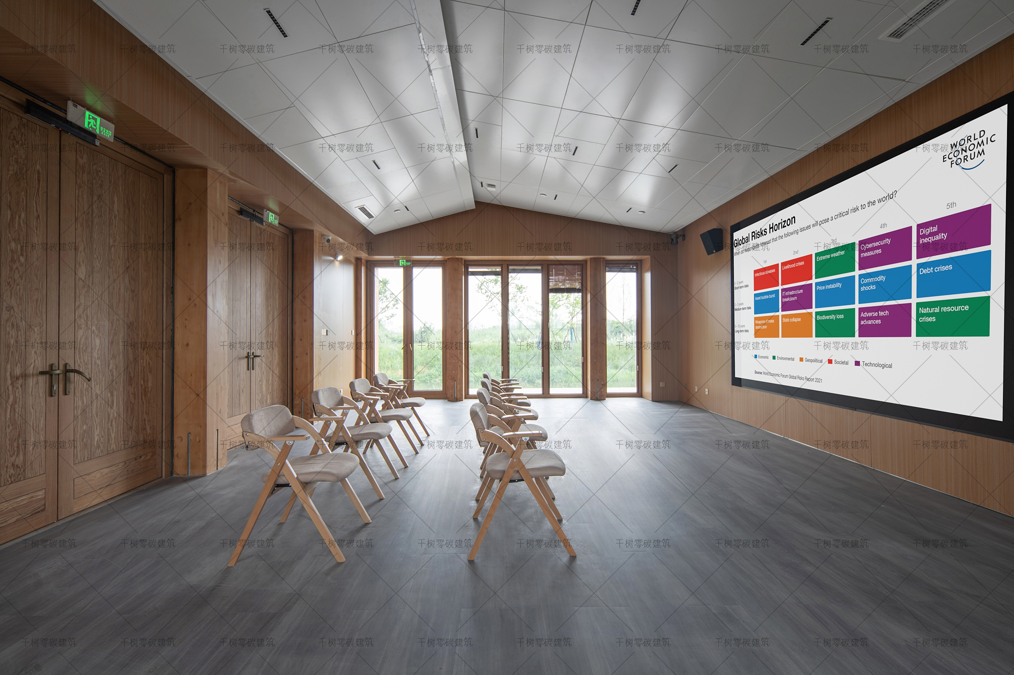 報告廳木屋和展示中心木屋墻面采用隔氣膜+內外雙層保溫(內保溫184mm厚,外保溫70mm厚)+CLT正交膠合木飾面板,屋面采用隔氣膜+保溫(屋面保溫235mm厚)+光伏瓦的圍護結構,門窗采用被動式節(jié)能阻燃木門窗(內置遮陽百葉),加上高能效的技術設備:地源熱泵系統(tǒng)、風力發(fā)電系統(tǒng)、建筑光伏一體化系統(tǒng)、光儲直柔系統(tǒng)、熱回收系統(tǒng),通過可視化的智慧運維管理平臺高效監(jiān)管、智慧運算,綜合管控與整治,最終實現(xiàn)了零碳建筑的目標。