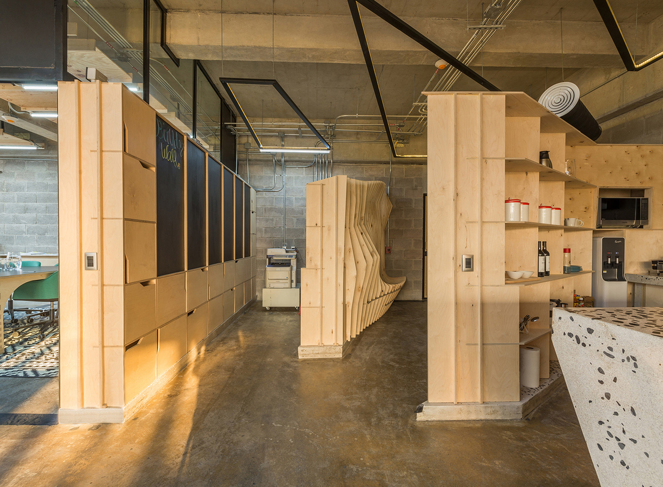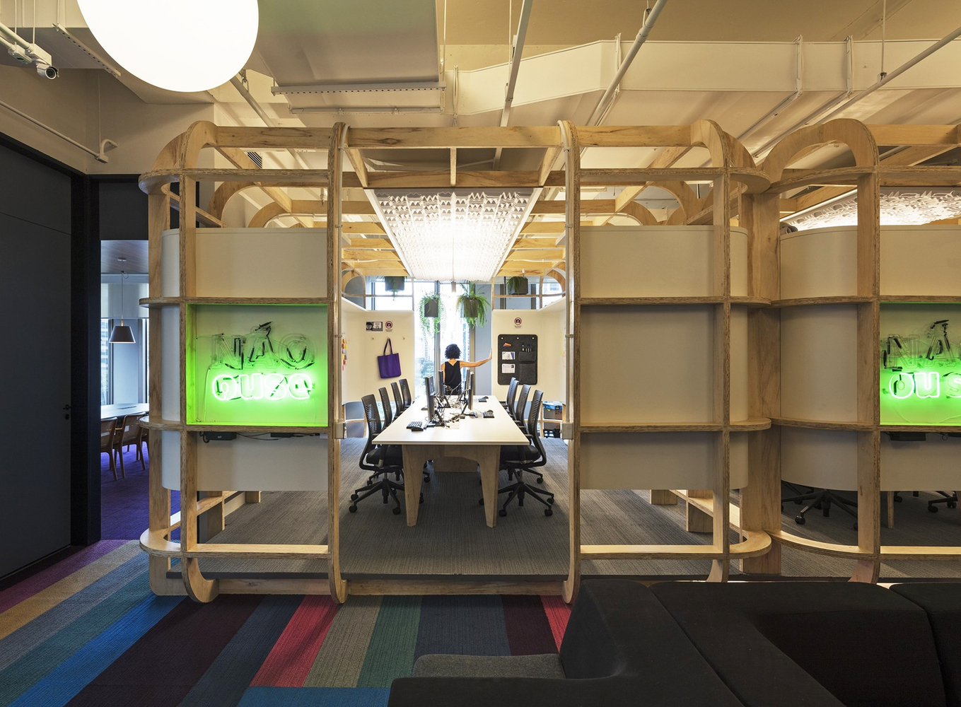 “Youse 的木工靈感來自晶圓廠實(shí)驗(yàn)室,體現(xiàn)了 CNC 海軍膠合板的原材料。景觀設(shè)計(jì)在視覺上溫暖了整個(gè)空間,提升了工作環(huán)境的品質(zhì)。各個(gè)單元專門為多學(xué)科團(tuán)隊(duì)分組以進(jìn)行特殊項(xiàng)目而設(shè)計(jì)。這些空間是半開放式系統(tǒng),最多可容納 12 人,保證團(tuán)隊(duì)隱私,同時(shí)也可由此進(jìn)入休息區(qū)。”