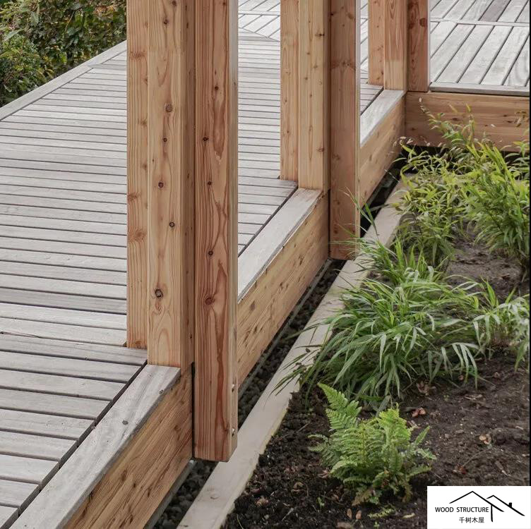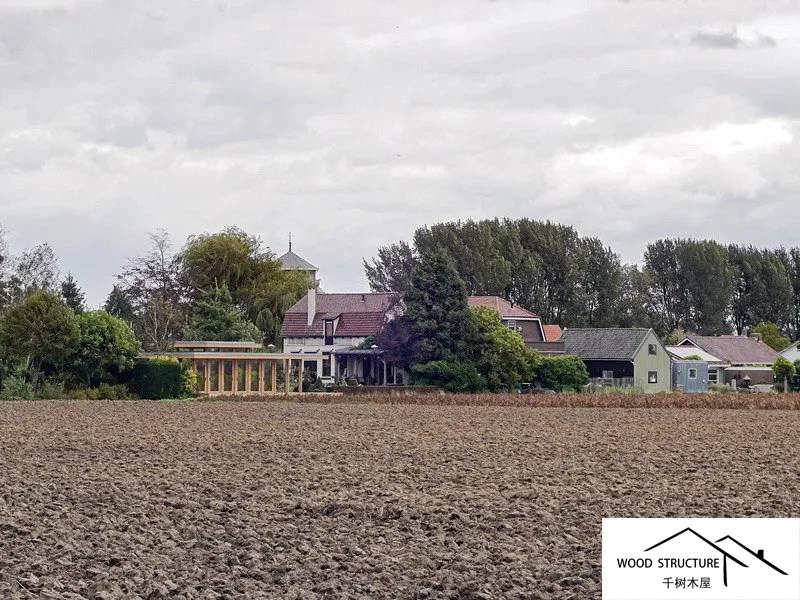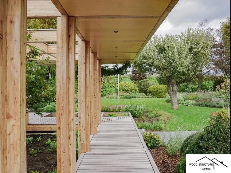 露臺(tái)甲板橋面懸挑在一條現(xiàn)有的溝渠上,這條溝渠創(chuàng)造了花園和農(nóng)田之間的邊界。從這個(gè)有利的位置可以觀察到不斷變化的農(nóng)田。涼棚與建筑結(jié)合在一起,從內(nèi)部與花園建立了非常直接的關(guān)系。大部分雨水通過屋頂引導(dǎo)到?jīng)雠?,灌溉植物和樹木。這個(gè)模塊化結(jié)構(gòu)采用落葉松層壓膠合板與CLT組合而成。