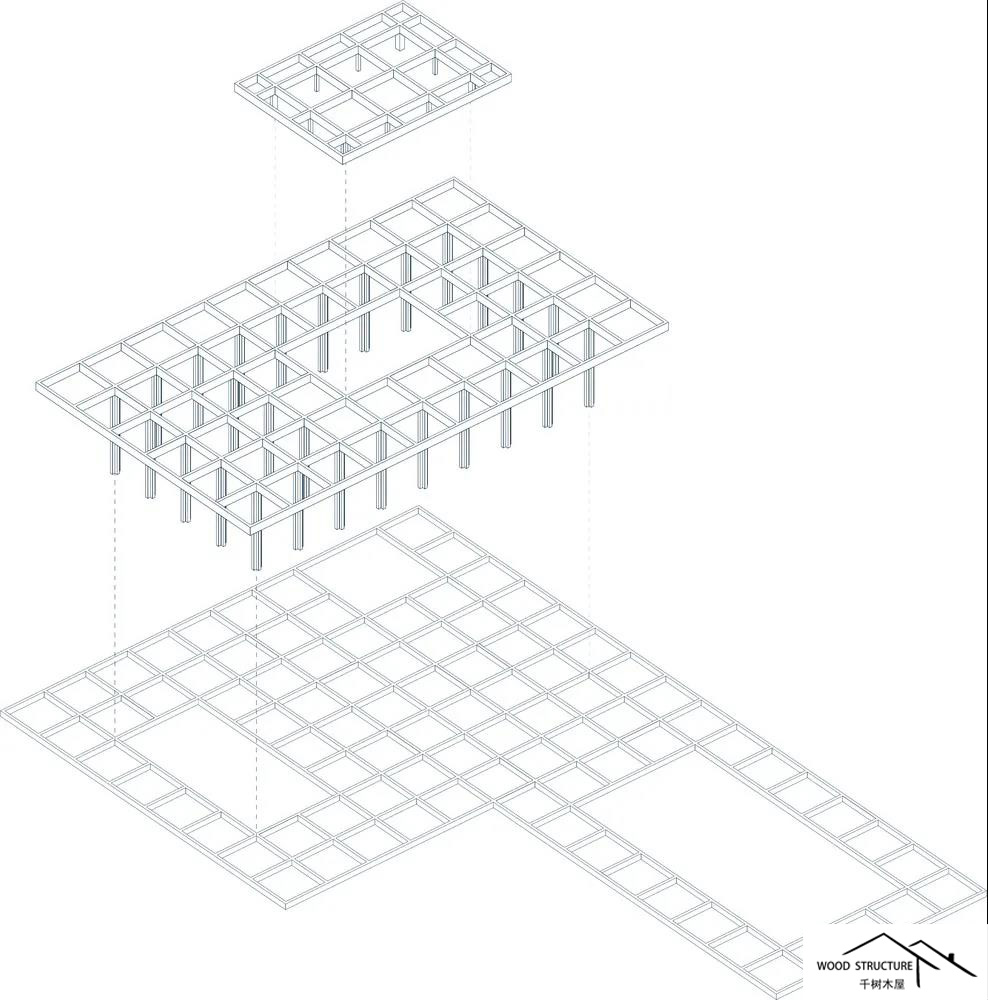 三個(gè)CLT墻體組成的結(jié)構(gòu)增加了柱和梁結(jié)構(gòu)的穩(wěn)定性。它是一個(gè)1.5米模數(shù)網(wǎng)格上的模塊化結(jié)構(gòu)設(shè)計(jì)。十字形的柱子放在網(wǎng)格上,支撐著屋頂。模塊化結(jié)構(gòu)由六個(gè)預(yù)制構(gòu)件填充。內(nèi)部樓層地板、外部樓層地板、開放式立面、封閉式立面、內(nèi)部屋頂板和外部屋頂板。在某些地方,建筑被故意留下未填充的空間,為植物和樹木創(chuàng)造空間。木材,木材,木材,這個(gè)建筑是用木材做的,以盡可能降低“碳排放”。