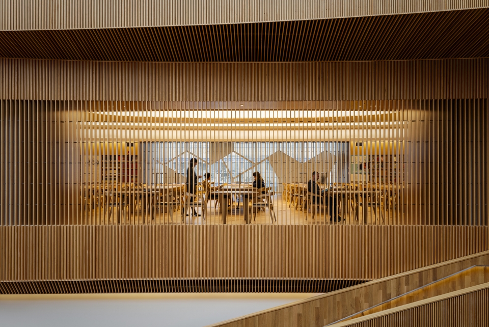 圖書館共有六層,分布著各種空間,比如數(shù)字空間,模擬空間,群體空間以及個人互動空間。圖書館頂層是大閱覽室,建筑師在設(shè)計時,把它構(gòu)想成藏在圖書館的珠寶盒,人們可以在這兒潛心研究,尋找靈感。進入大閱覽室之前要先經(jīng)過一個過渡空間,過渡空間光線柔和,聲效優(yōu)良。室內(nèi)利用木質(zhì)格柵而非實體墻壁來環(huán)繞空間,這樣既保證了隱私,又有一定的可見度。陽光透過木條的縫隙照亮了中庭和西立面之間的空間。