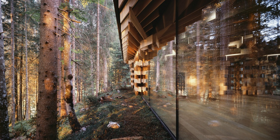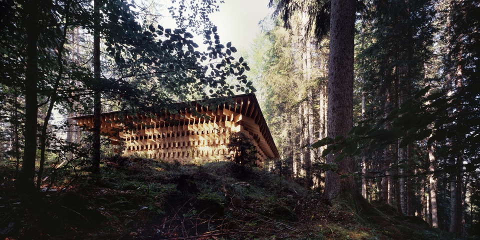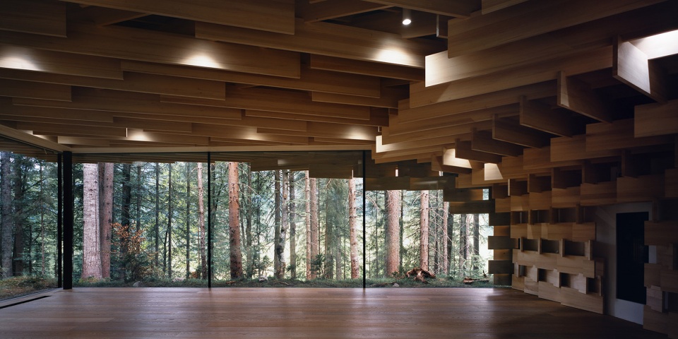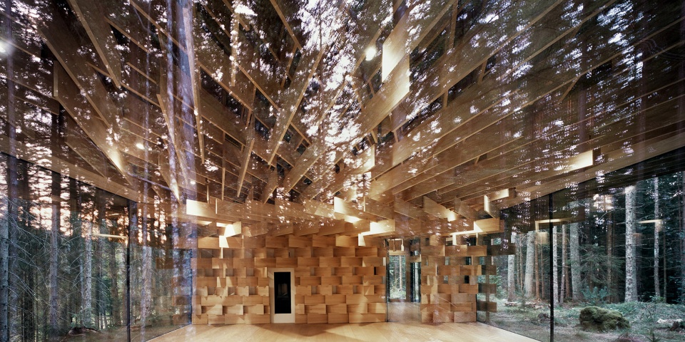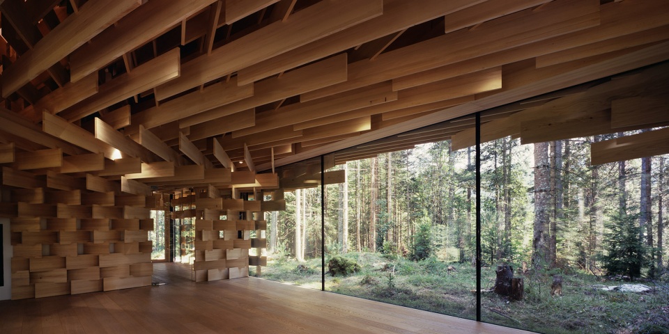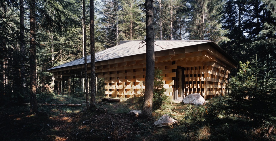 該建筑以生長在場地附近的冷杉樹為主要材料,3厘米寬的木板像樹枝一樣堆疊起來,在廣闊的森林和精致的建筑間形成一種柔和的過渡。小屋同樣也充當了使人融入森林的媒介。陽光透過枝葉間的縫隙從天窗透進室內,帶來森林中常??梢泽w驗到的“komorebi”(木漏れ日)般的效果。