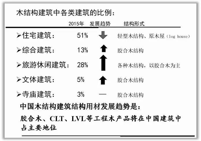 幾十年來,磚混結(jié)構(gòu)已廣泛應(yīng)用于我們的民用建筑中。施工成本低,給人以安全感,耐用性和低維護(hù)成本,而木結(jié)構(gòu)房屋不穩(wěn)定,不安全,易著火,易受害蟲害。遇水分會(huì)導(dǎo)致腐爛和霉變,因此難以接受這種新的木結(jié)構(gòu)建筑。由于對(duì)現(xiàn)代木結(jié)構(gòu)的理解不足,因而產(chǎn)生這些疑問是正常的。只要在成本,安全,保護(hù),功能等方面采取適當(dāng)措施,通過大量的實(shí)驗(yàn)比較,專業(yè)知識(shí)的宣傳,樣板房的示范,特別是中國(guó)古代木結(jié)構(gòu)建筑和文化的影響,我相信人們的思想會(huì)發(fā)生變化,而木結(jié)構(gòu)建筑的生活體驗(yàn)也會(huì)影響人們的固有觀念?,F(xiàn)代木結(jié)構(gòu)完全可以被接受。下圖所示的各類木結(jié)構(gòu)建筑發(fā)展趨勢(shì)也能說明這一點(diǎn)。