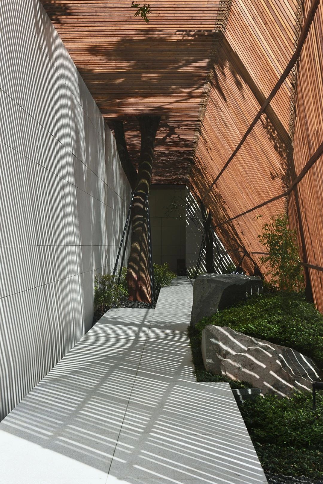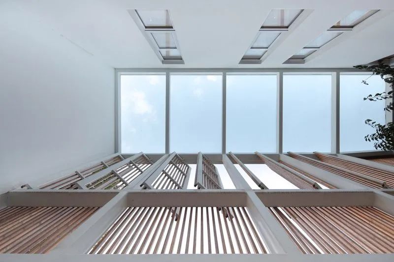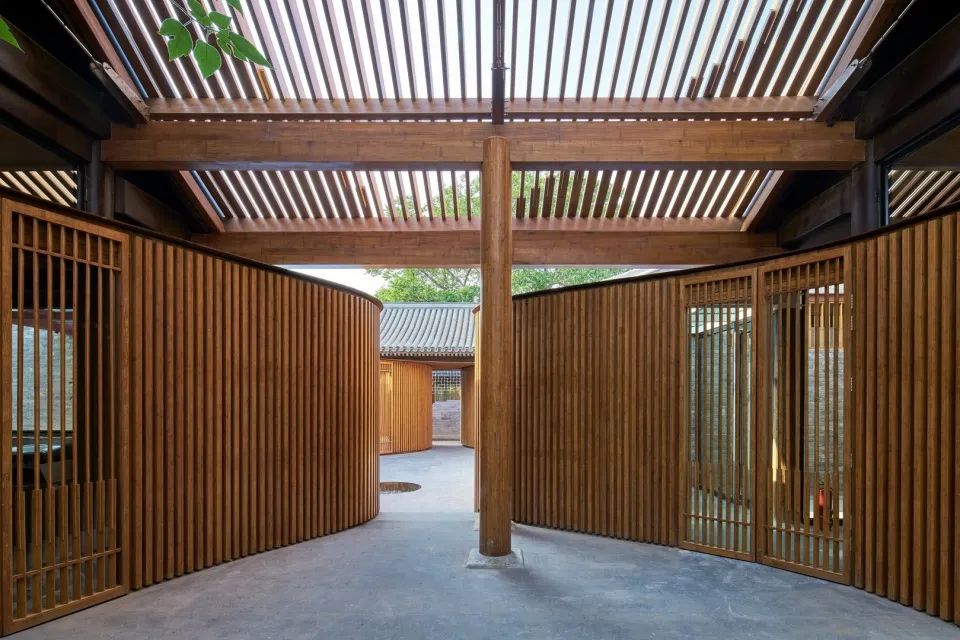屋頂用原先木架尺寸的竹鋼梁架搭接,椽子采用十字交叉竹鋼構(gòu)件組合,在小院的正上方勾勒出葫蘆形的輪廓,通透的竹鋼板屋面一方面呼應(yīng)了原有屋瓦的尺度,又形成屋面中間更為通透的效果,給屋中小院引入充足的陽(yáng)光,便于樹木生長(zhǎng)。
