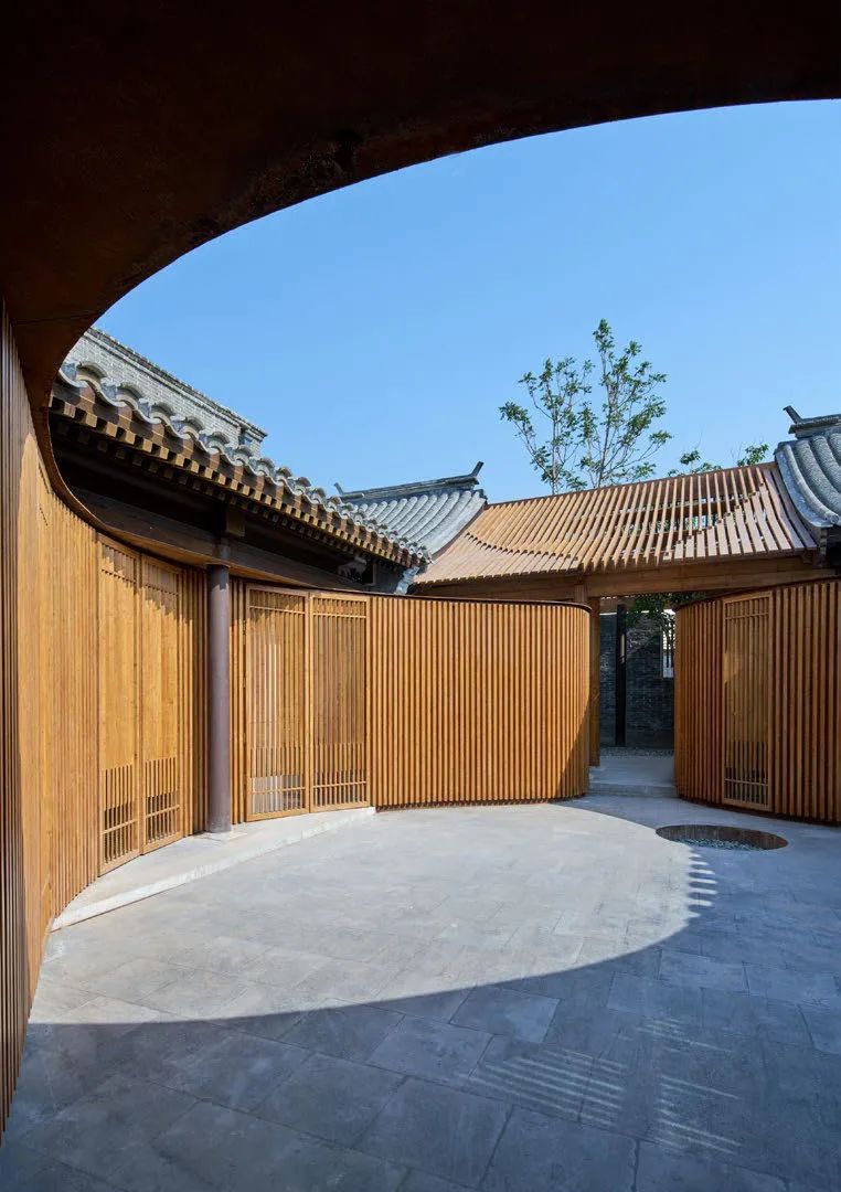 曲面屋頂聯(lián)系起整個(gè)建筑群落,豎向的桿件結(jié)合曲面屋面,組成自由、輕盈的建筑形態(tài),取材延續(xù)中國(guó)古建筑的質(zhì)樸自然,借助青瓦、鋼木等,打造建筑的原始與本真,釋放出閑適愜意的空間氛圍。