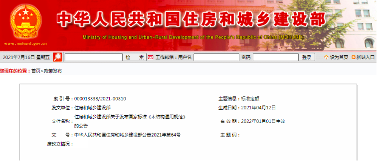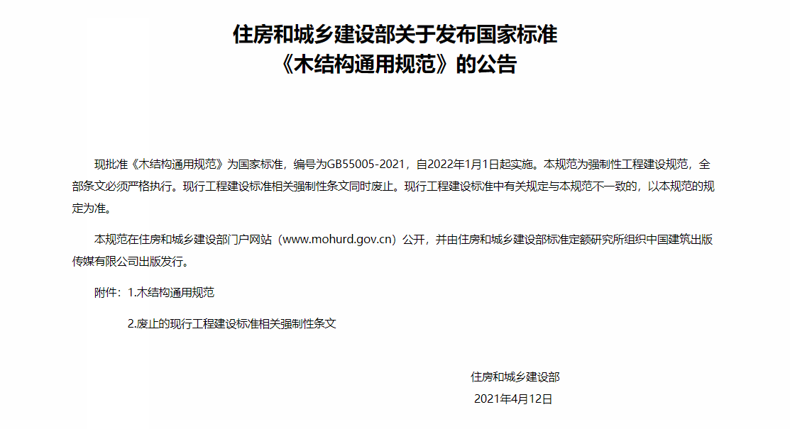 近日,住房和城鄉(xiāng)建設(shè)部正式發(fā)布國(guó)家標(biāo)準(zhǔn)《木結(jié)構(gòu)通用規(guī)范》(GB55005-2021)的批準(zhǔn)公告,自2022年1月1日起實(shí)施。