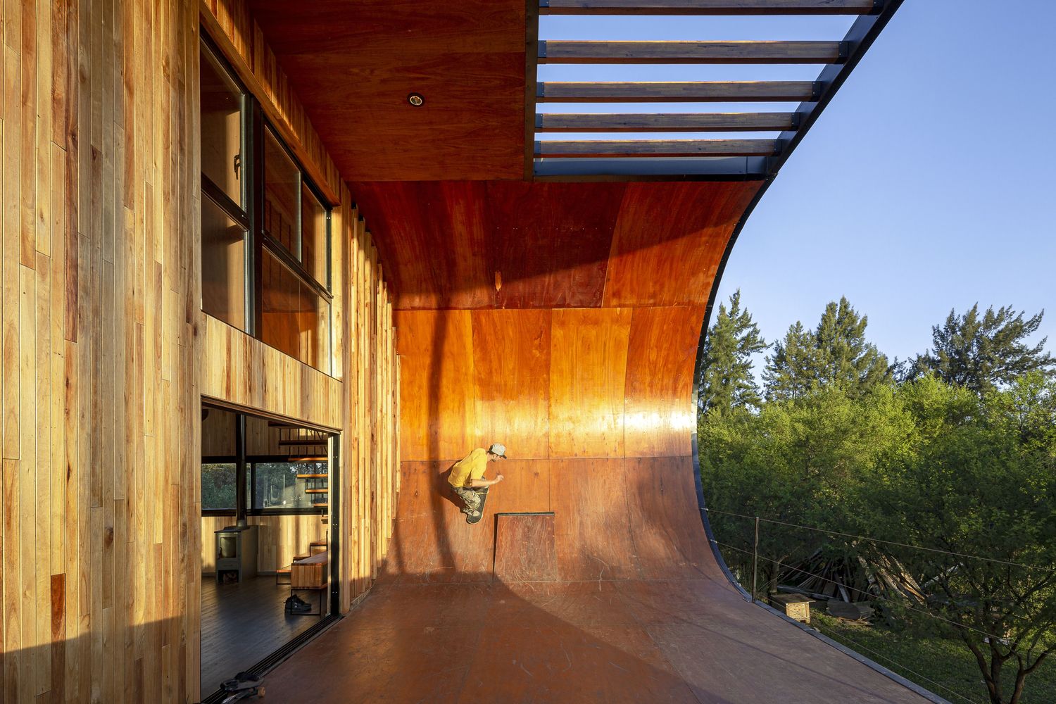 這是一個(gè)100%可持續(xù)的住宅,同時(shí)業(yè)主也可以在上面滑滑板。業(yè)主是一名滑板者,希望房子本身附帶一個(gè)滑板場(chǎng)地。設(shè)計(jì)師將室外陽(yáng)臺(tái)設(shè)計(jì)成滑道,并在向南一側(cè)設(shè)置一面墻,在住宅東南角形成一個(gè)向上的弧形用于減速。這面墻延伸到了屋檐處,起到阻擋夏天烈日的作用。